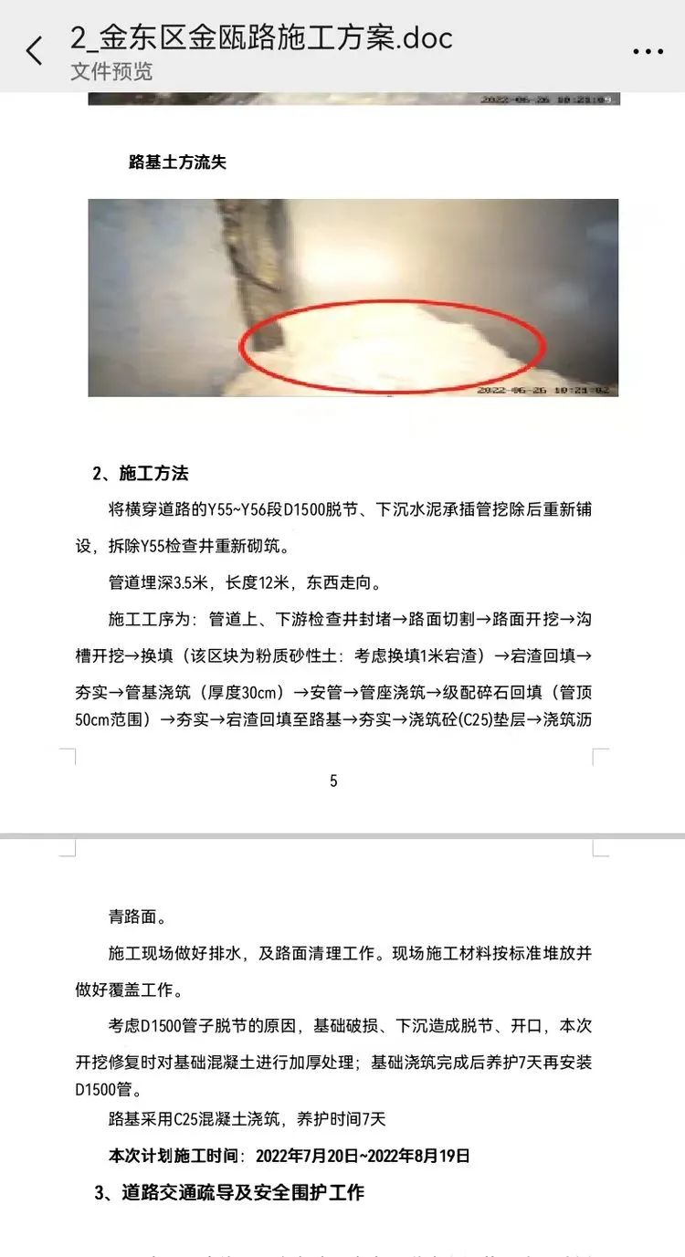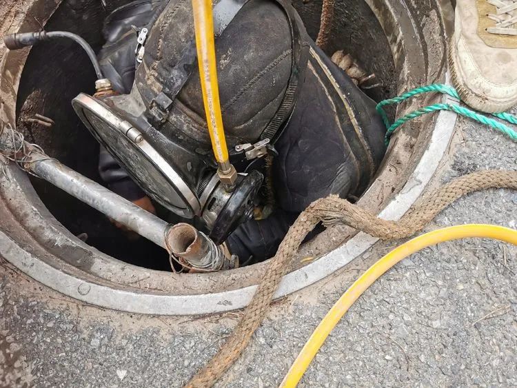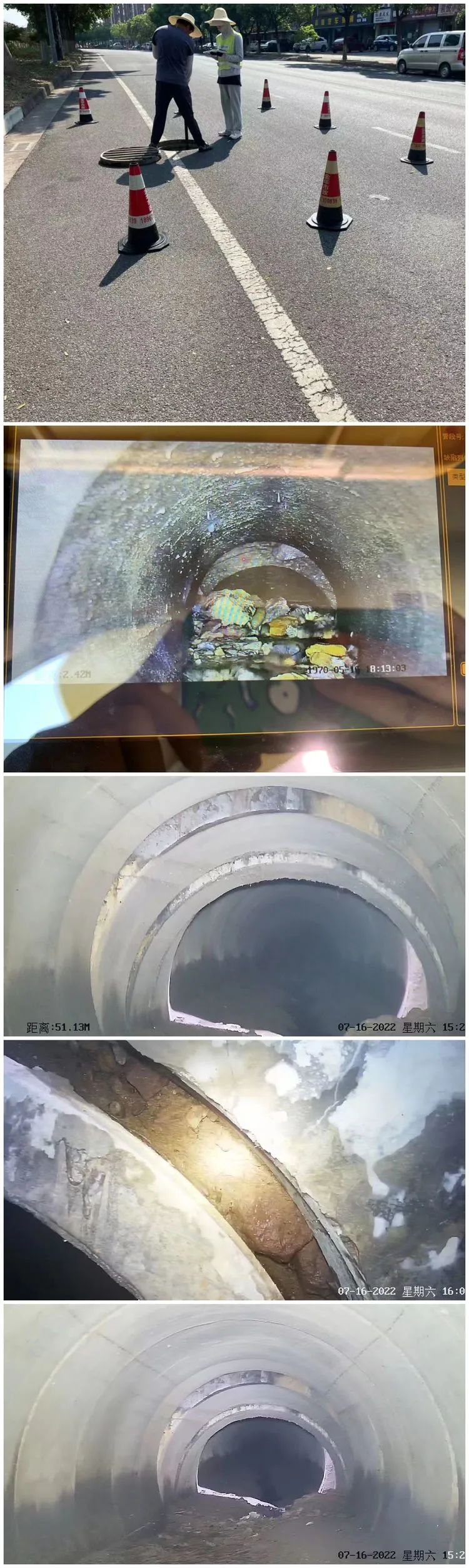 做好塌方部位安全维护工作后,检测组人员进场将机器人送入管道内,对塌陷处管网井室进行排查、检测。依据机器人在管网内传回检测图片,结合现场实际,编制交通组织方案、施工方案。潜水员下井对开挖点位上、下游管口用气囊封堵,将雨污水进行截流。采用160汽油自吸泵抽水、避免基坑受水浸泡造成塌方。